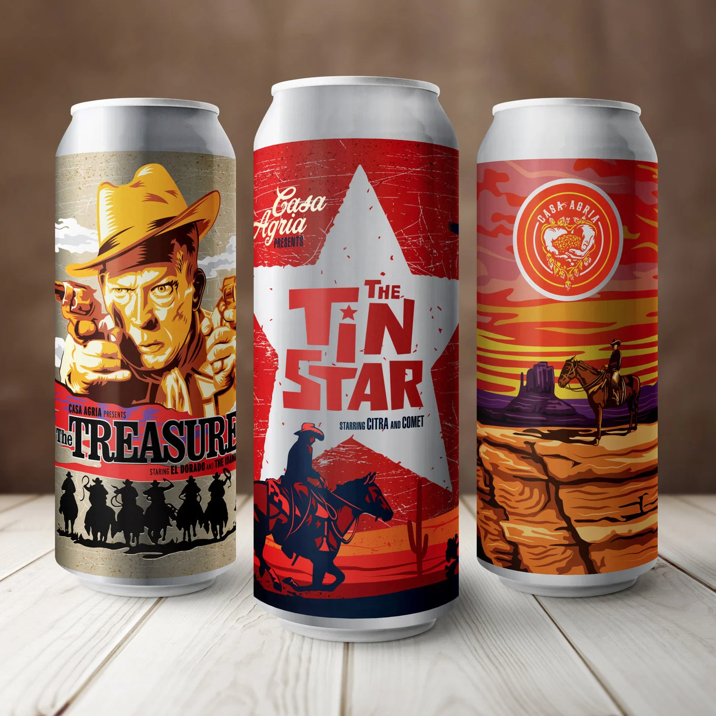 Three 16 ounce cans for Casa Agria Specialty Ales, illustrated in a western theme.